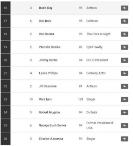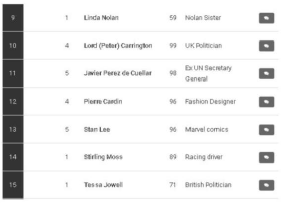 PEKİ O LİSTEDE BAŞKA HANGİ İSİMLER VAR? Listedeki en genç isim olarak 51 yaşındak ünlü İngiliz futbolcu yer alırken, en yaşlı isim ise 103 yaşına basan ABD'li romancı Herman Wouk oldu.