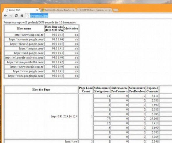 chrome://dns/ komutunu kullanarak ön-bellekteki DNS kayıtlarını görebilirsiniz.