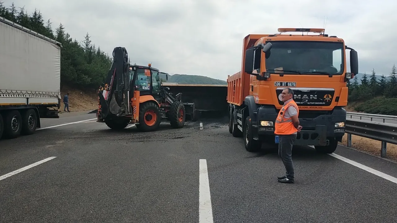 Trafik, Abant Kavşağı’ndan D-100 karayoluna yönlendirilirken, ekipler kamyonu kaldırmak ve yolu yeniden ulaşıma açmak için çalışmalarını sürdürüyor.